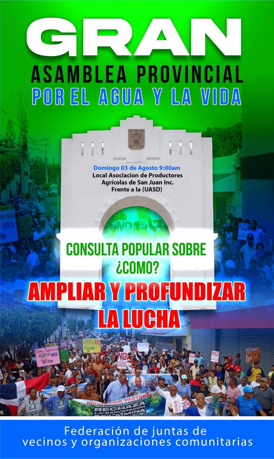 En ese sentido, la Federación de Juntas de Vecinos y Organizaciones Comunitarias (FEJUNVEOC), de San Juan de la Maguana, anuncia una gran asamblea provincial en «defensa del agua y de la vida».