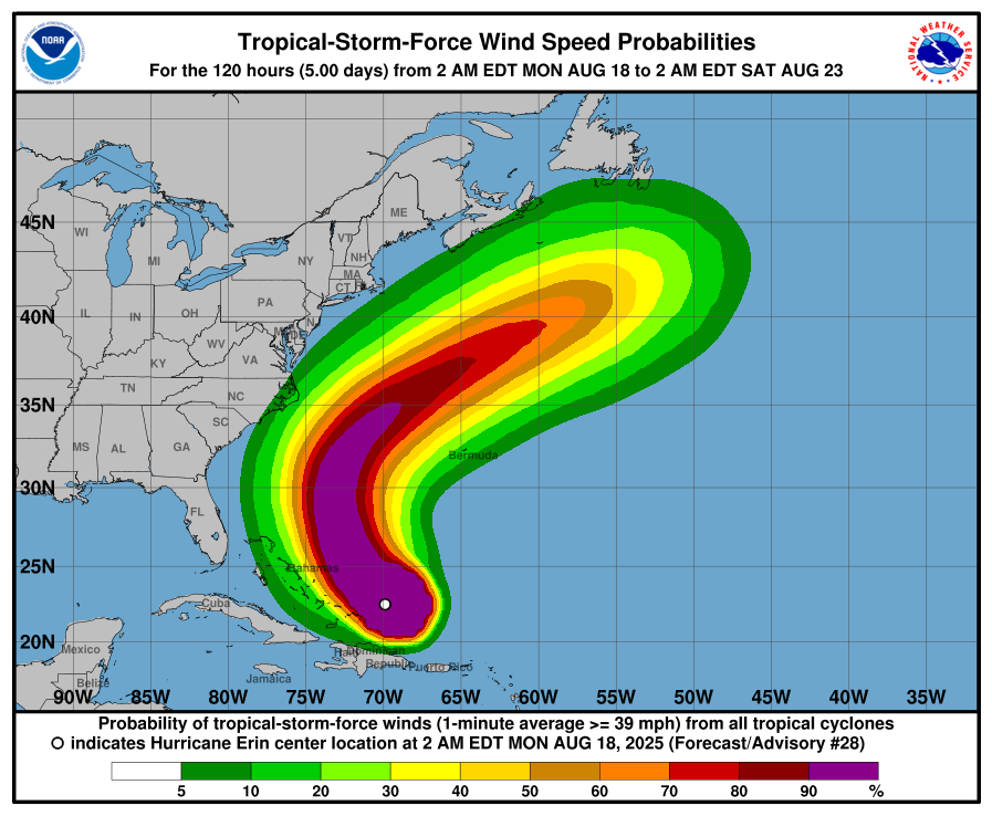 Asimismo, dijo que a las 7:00 de la mañana de este lunes, el huracán Erín fue localizado cerca de la latitud 22.8 norte y longitud 70.2, a 170 km al nor/noreste de la Isla Gran Turk.