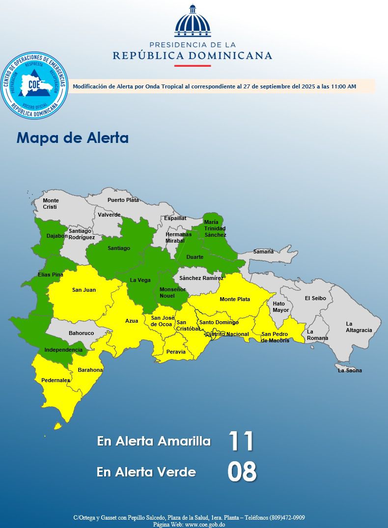 Las provincias en alerta amarilla son: Santo Domingo, Distrito Nacional, San Cristóbal, San José de Ocoa, Pedernales, San Juan, Monte Plata, San Pedro de Macorís, Peravia, Barahona y Azua.
