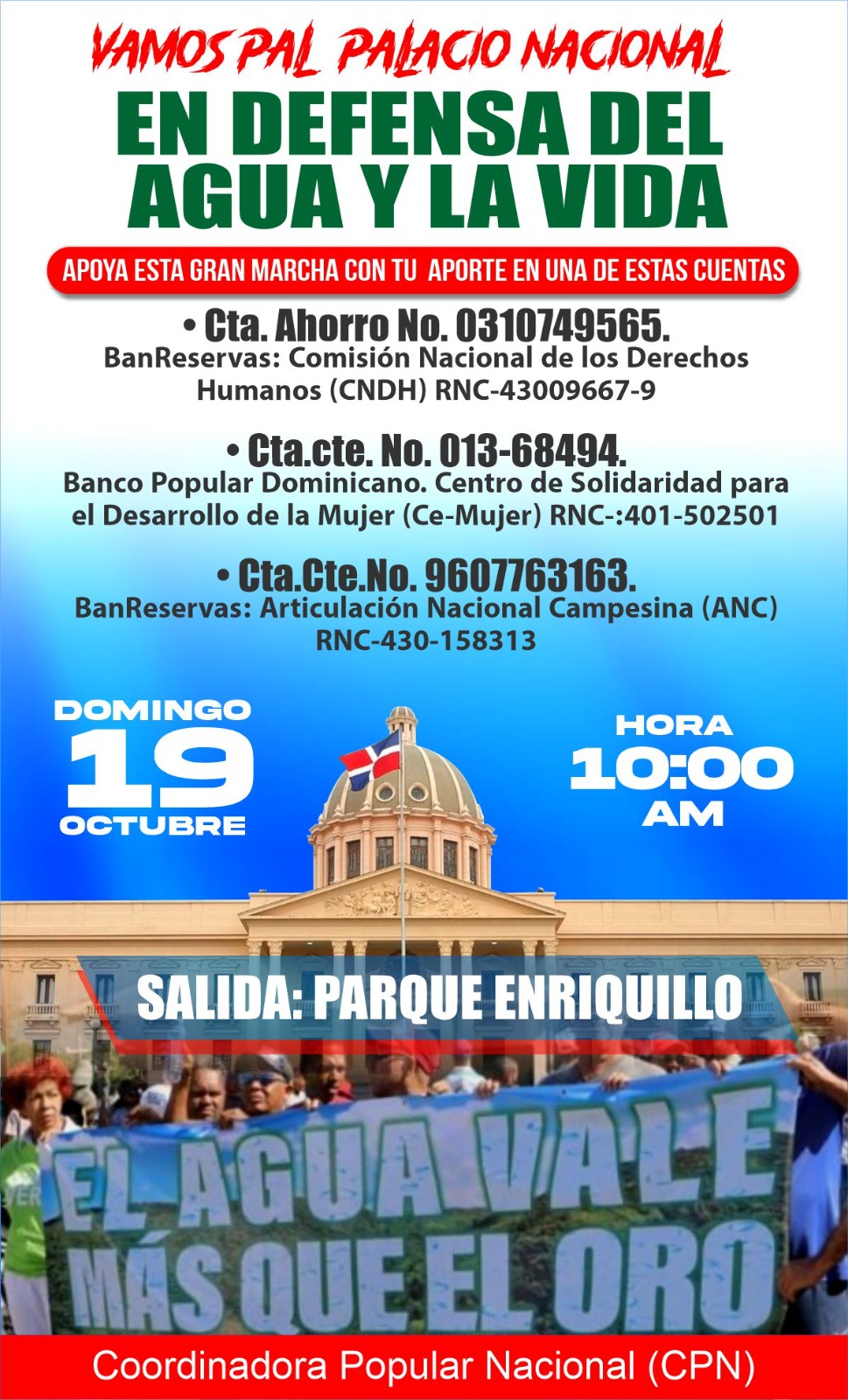 Bajo el entendido de que, «solo el pueblo salva al pueblo», la Coordinadora Popular Nacional (CPN), ratificó la marcha a efectuarse este domingo 19 de octubre en defensa de la vida, las aguas, el medio ambiente, alto costo de la vida, inseguridad, en favor del medio ambiente, entre otras exigencias.