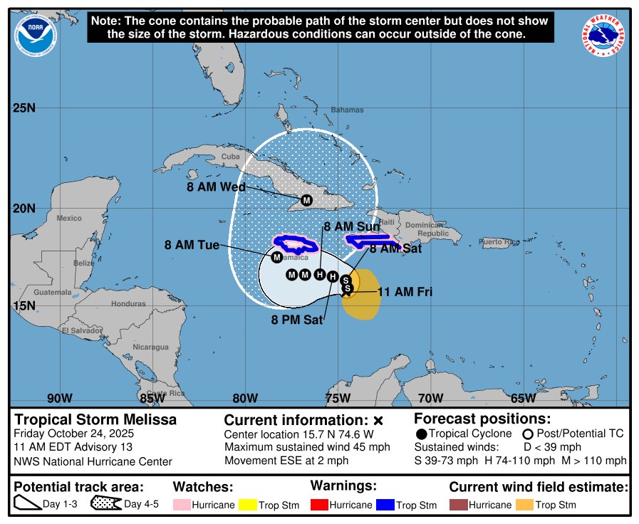 A eso de las 8:00 de la mañana de hoy, Melissa fue localizada aproximadamente a unos 375 kilómetros al suroeste de Puerto Príncipe (Haití) y a 260 km al sureste de Kingston (Jamaica), moviéndose hacia el oeste/noroeste a 2 km/h.