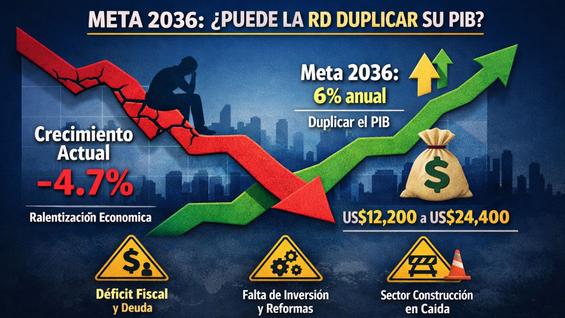 La República Dominicana enfrenta serias dificultades para alcanzar la Meta Presidencial 2036, que plantea duplicar el Producto Interno Bruto (PIB) en los próximos diez años, si la economía no logra retomar su ritmo de crecimiento potencial, advirtieron los economistas Antonio Ciriaco y Henri Hebrard.