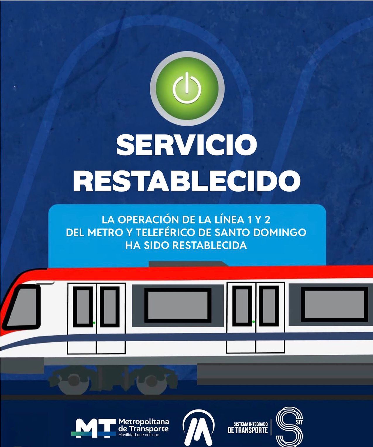 “El servicio de la Línea 1 y 2 del Metro y Teleférico de Santo Domingo ha sido restablecido. Los usuarios podrán acceder al sistema de forma gratuita. Agradecemos su comprensión y ofrecemos disculpas por los inconvenientes ocasionados”, indicó la entidad a través de sus redes sociales.