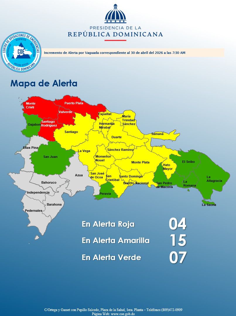 El Centro de Operaciones de Emergencias (COE) elevó este jueves los niveles de alerta en gran parte del país, colocando cuatro provincias en alerta roja, 14 junto al Distrito Nacional en amarilla y siete en verde, ante la amenaza de inundaciones por una vaguada.